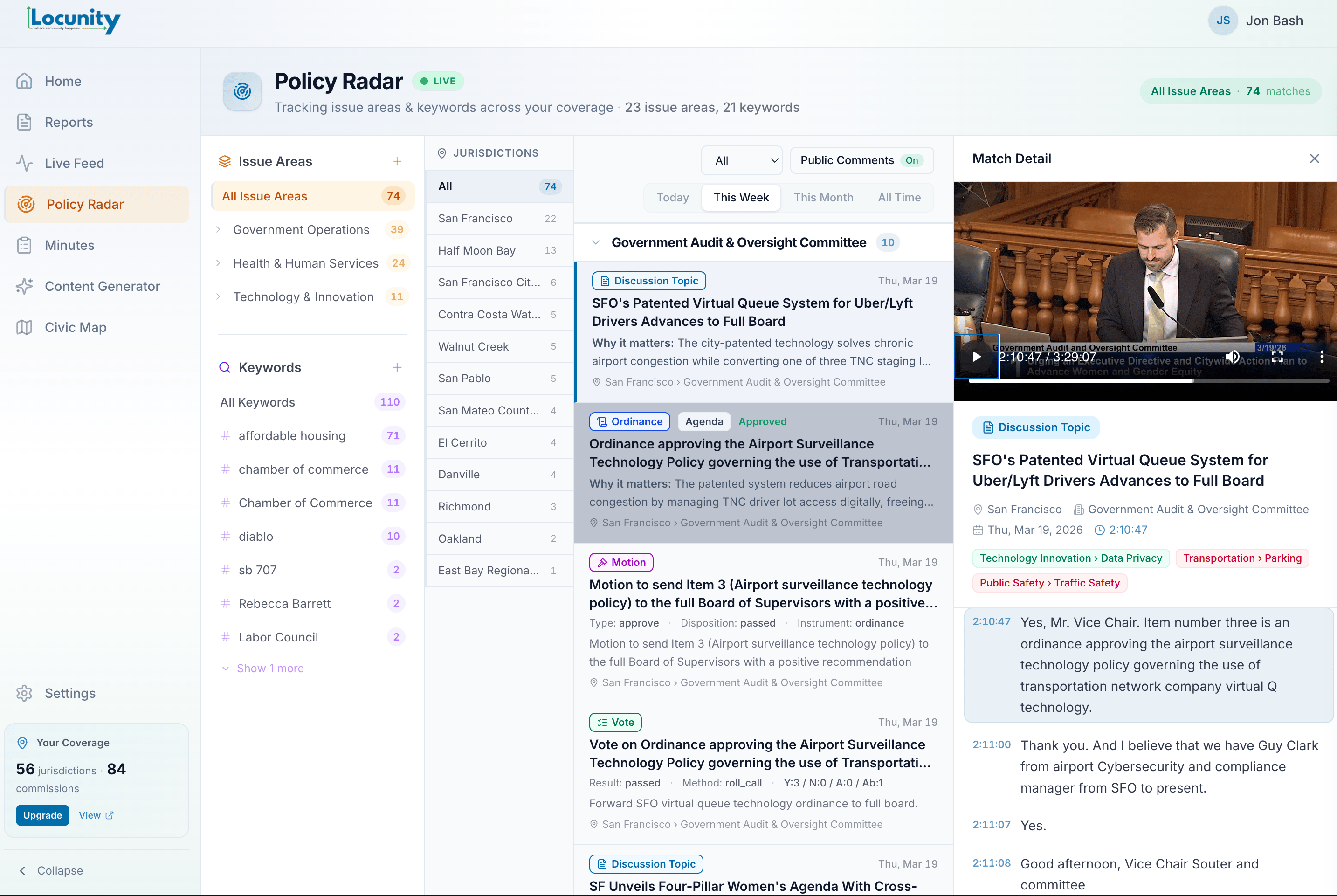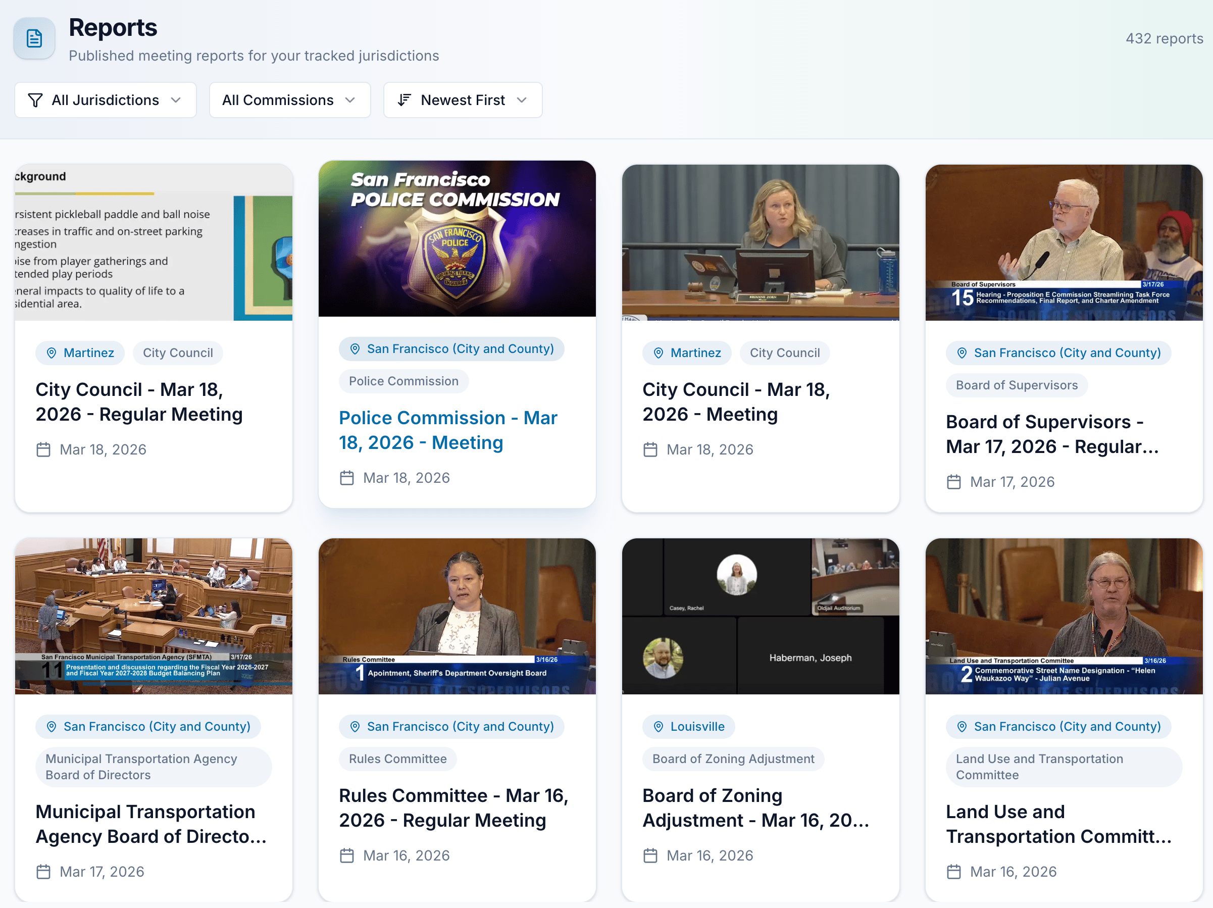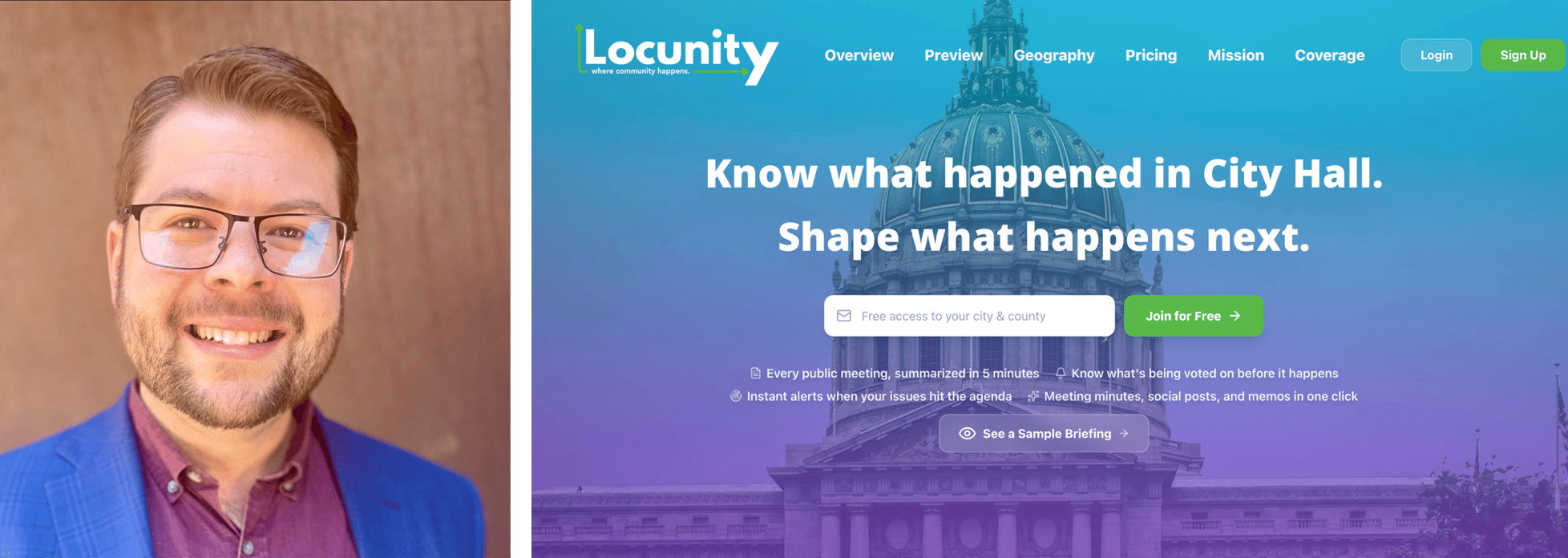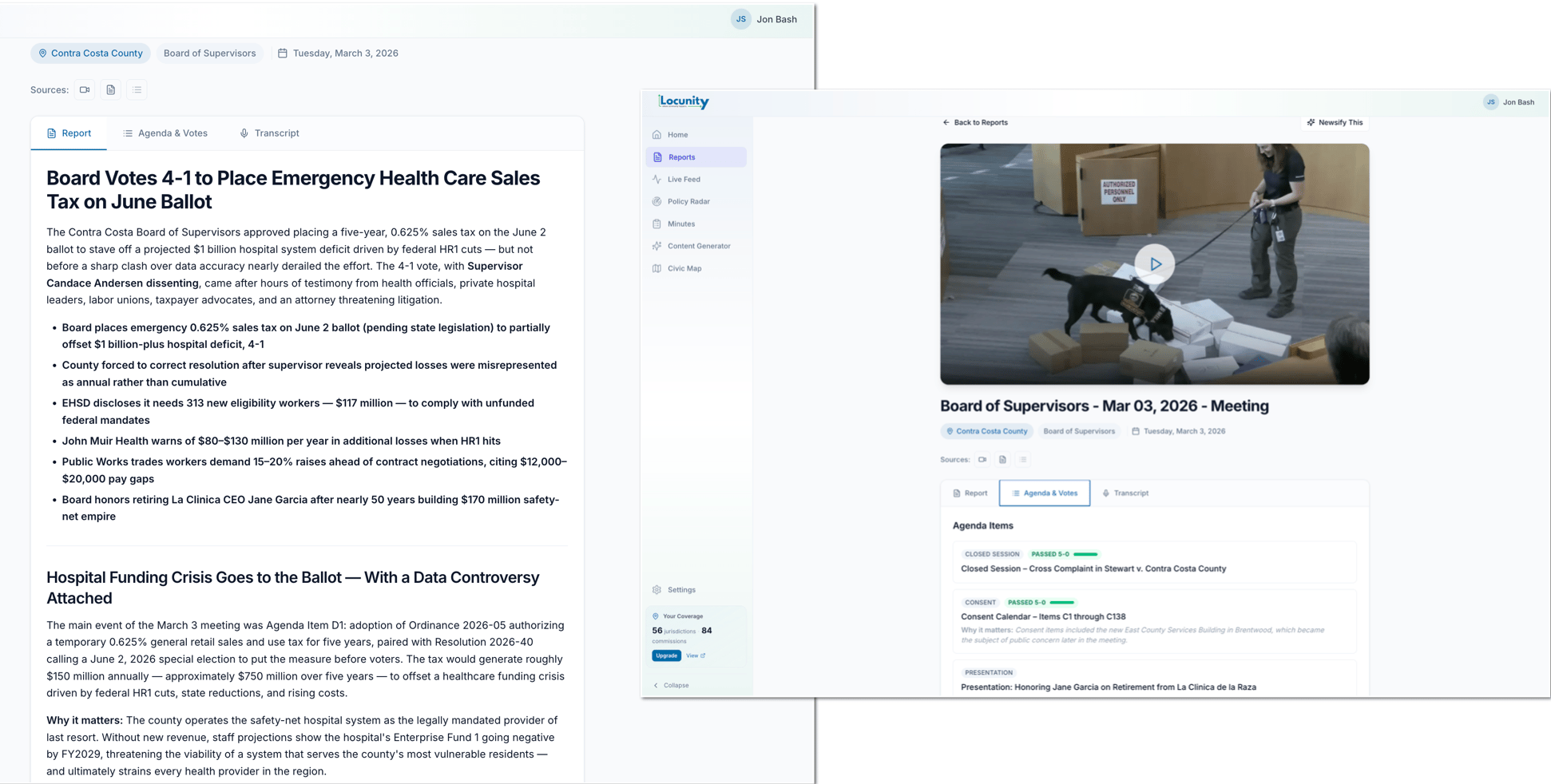 Locunity überwacht öffentliche Sitzungen - Stadträte, Planungskommissionen, Schulbehörden - und verwandelt sie in Newsletter-Briefings. Die KI durchsucht Sitzungsvideos, strukturiert das Gesagte, zieht Zitate und Abstimmungsergebnisse heraus und schreibt daraus einen Bericht im Stil eines Politico-Newsletters statt eines trockenen Protokolls. Ein menschlicher Redakteur prüft vor der Veröffentlichung Namen, Schreibweisen und Zahlen.